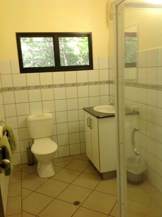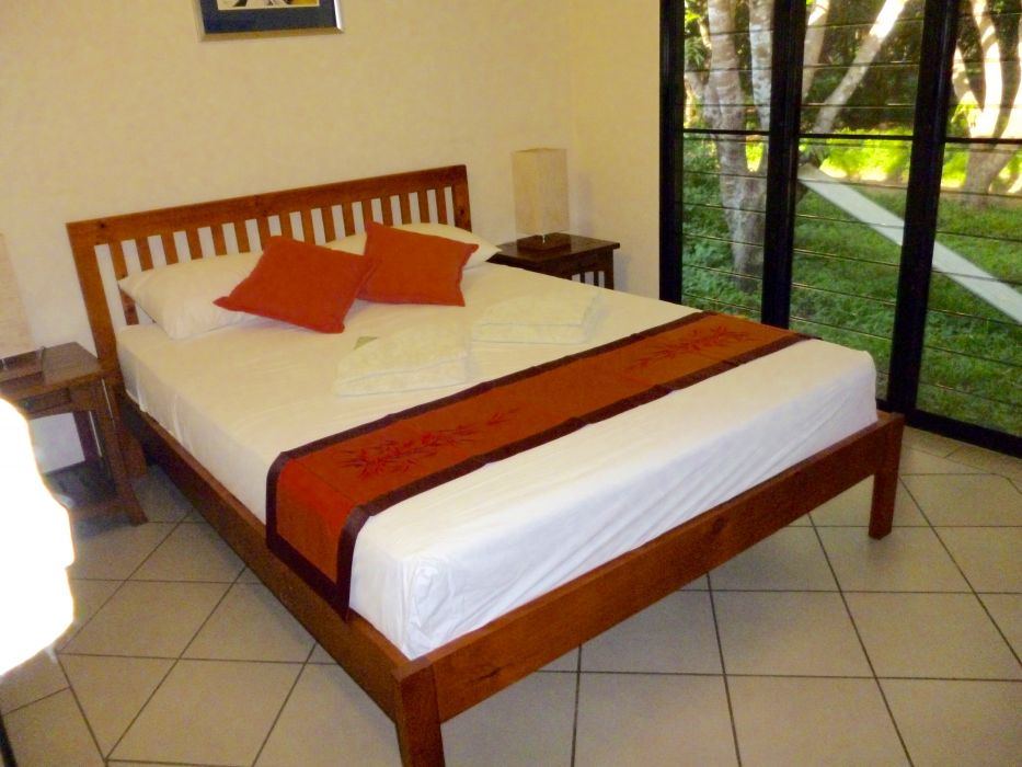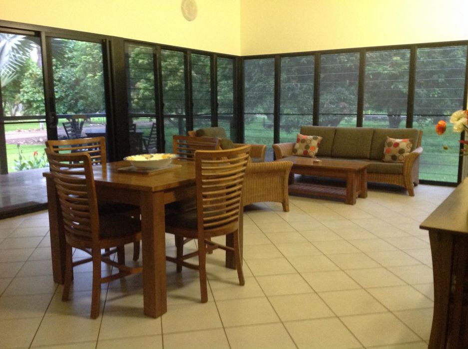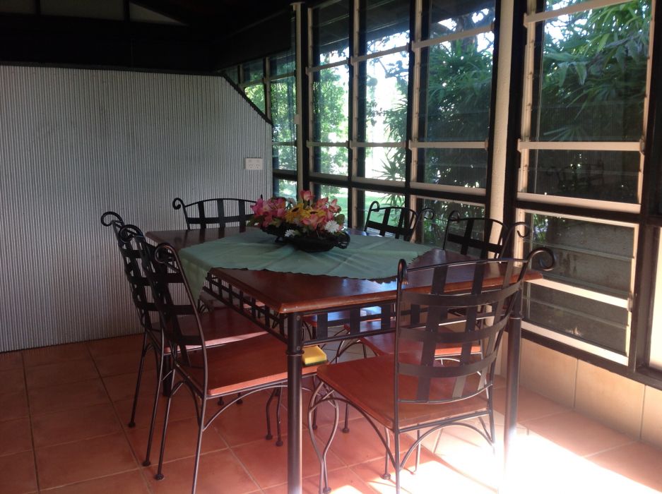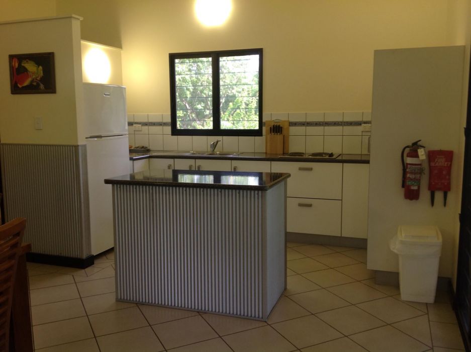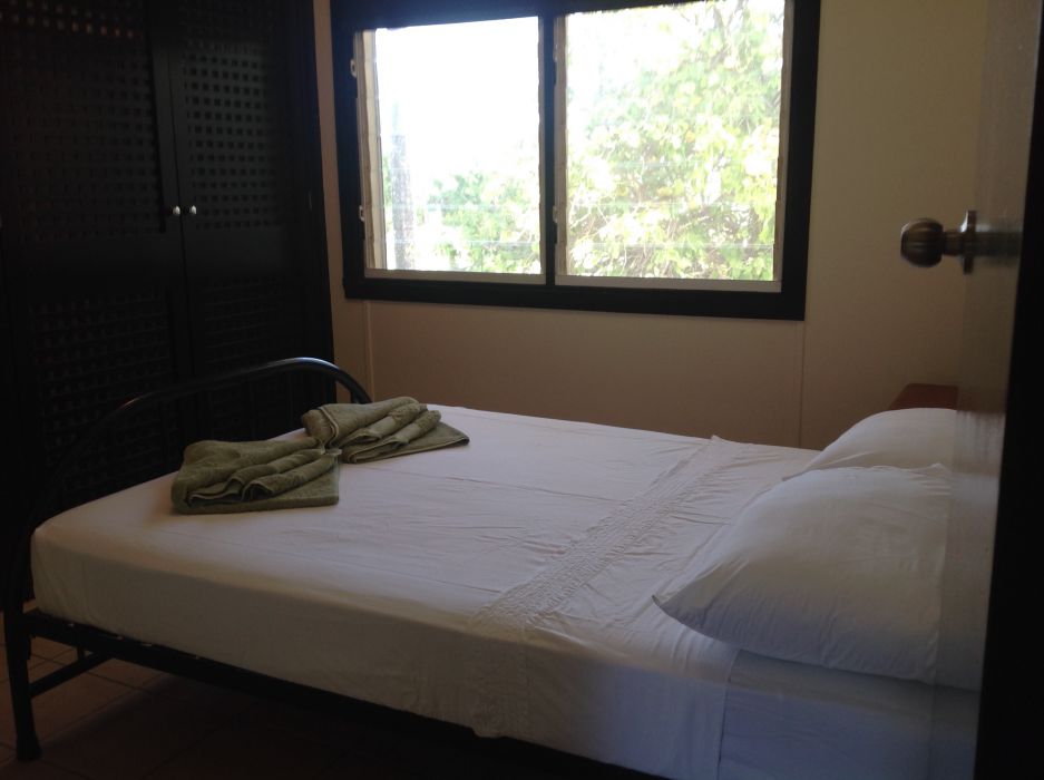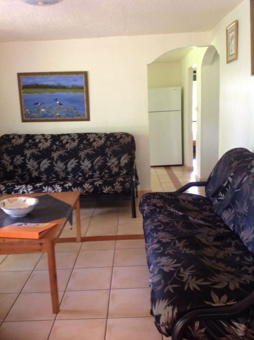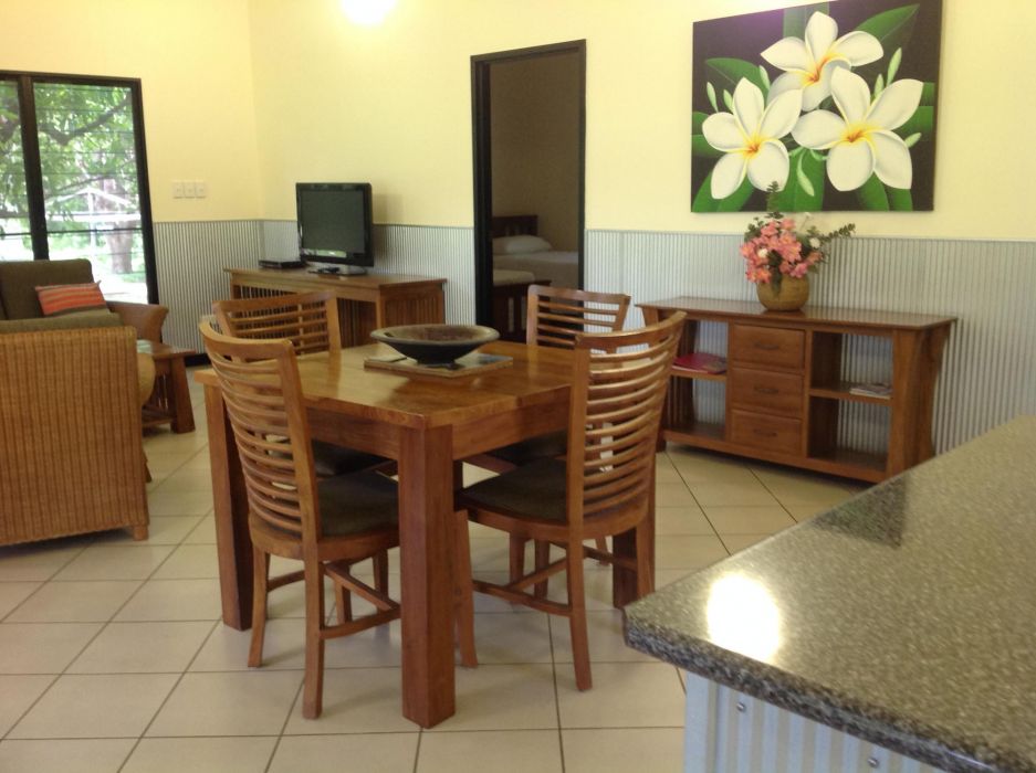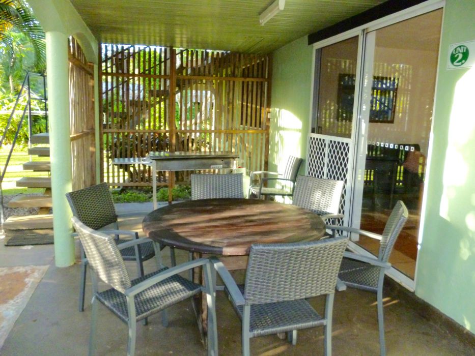 Unit 2 is on the ground floor of the Fisherman's Lodge. It can accommodate up to 6 people with three bedrooms (can accommodate 7 with extra trundal bed), bedroom one with a double bed and air-conditioning, bedroom two with 2 single beds and Bedroom three with 2 single beds. All linen and towels are provided and each room has its own fan. With its own dining room and TV, bathroom, fully equipped kitchen with fridge and gas stove, it also overlooks a tropical garden with palm trees and grassy areas.